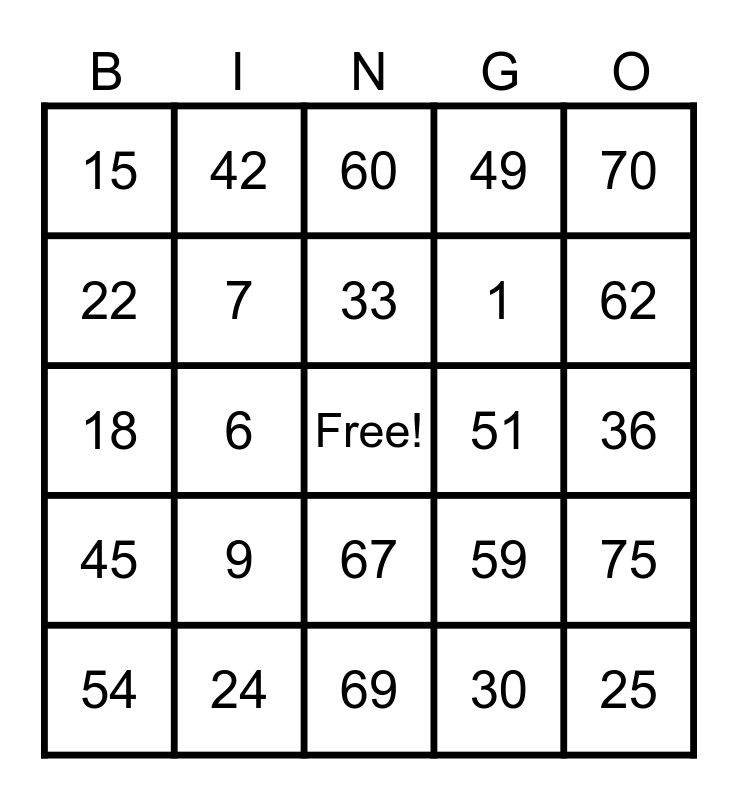 This bingo card has a free space and 24 words: 9, 24, 33, 54, 70, 15, 22, 42, 51, 67, 1, 18, 59, 75, 7, 30, 36, 60, 62, 6, 25, 45, 49 and 69.