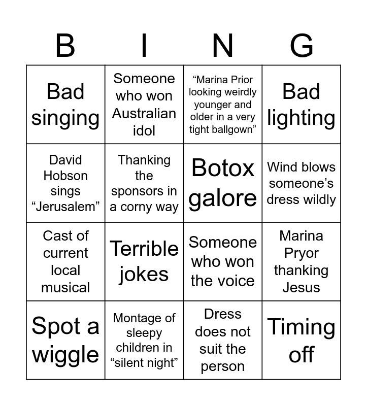 This bingo card has 16 words: Montage of sleepy children in “silent night”, Marina Pryor thanking Jesus, “Marina Prior looking weirdly younger and older in a very tight ballgown”, Bad singing, Cast of current local musical, Someone who won Australian idol, Someone who won the voice, Dress does not suit the person, David Hobson sings “Jerusalem”, Thanking the sponsors in a corny way, Spot a wiggle, Bad lighting, Terrible jokes, Wind blows someone’s dress wildly, Botox galore and Timing off.