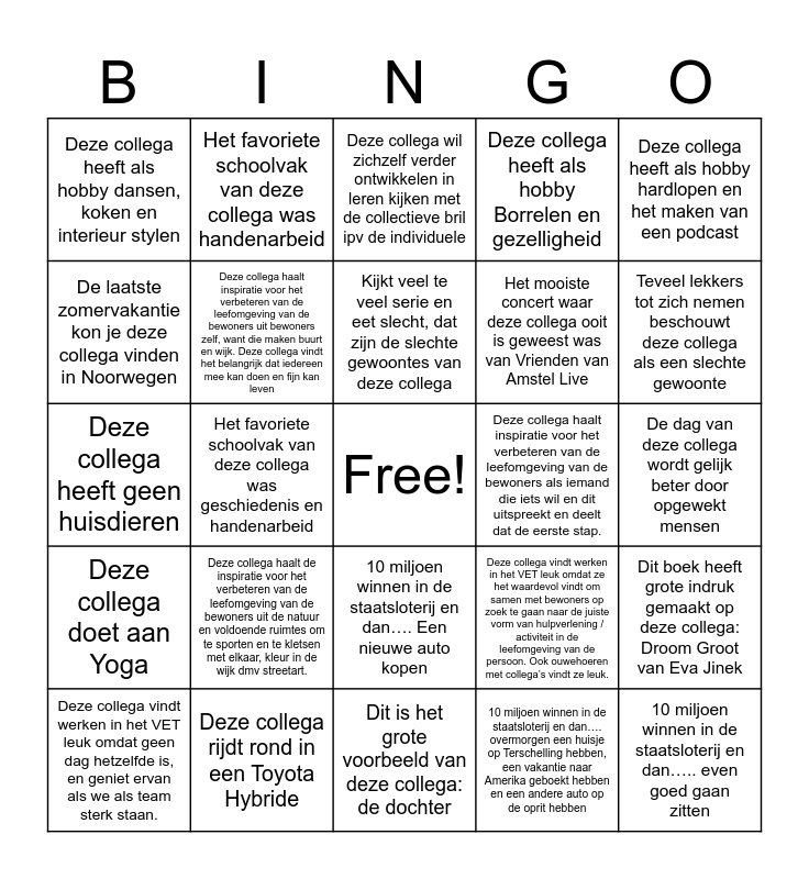 This bingo card has a free space and 196 words: Deze collega besteed de vrije dag het liefst met vrienden en familie, Deze collega besteed de vrije dag het liefst door piano te spelen, Deze collega besteed de vrije dag het liefst door een beetje uit te slapen, koffie te drinken en een mooie wandeltocht te maken, Deze collega besteed de vrije dag het liefst in de Sauna met haat vriend, maar ze wil ook wel naar de Efteling, Deze collega besteed de vrije dag het liefst lunchend, uit etend, winkelend en borrelend, Deze collega besteed de vrije dag het liefst door veel buiten te zijn en ergens te lunchen, Deze collega besteed de vrije dag het liefst door samen met gezin te wandelen en te genieten van de natuur, Deze collega besteed de vrije dag het liefst aan natuur, cultuur en met vrienden en familie, Deze collega besteed de vrije dag het liefst- wandelen met hond en hardlopend, Het mooiste concert waar deze collega ooit is geweest was van Vrienden van Amstel Live, Het mooiste concert waar deze collega ooit is geweest was van David Bowie en Carmina Burana, Het mooiste concert waar deze collega ooit is geweest was van Bruce Springsteen, Het mooiste concert waar deze collega ooit is geweest was van U2, Het mooiste concert waar deze collega ooit is geweest was van Coldplay, Het mooiste concert waar deze collega ooit is geweest was tijdens Pinkpop, Het mooiste concert waar deze collega ooit is geweest was van Messiah in Utrecht, Het mooiste concert waar deze collega ooit is geweest was van Lady Gaga, Deze collega rijdt rond in een Peugeot 107, Deze collega rijdt rond in een Ford Focus StationWagon, Deze collega rijdt rond in een Peugeot 208, Deze collega rijdt rond in een Volvo V50, denkt hij / zij…., Deze collega rijdt rond in een Peugeot 308, Deze collega rijdt rond in een Nissan Micra, Deze collega rijdt rond in een Seat Mii, Deze collega rijdt rond in een Toyota Hybride, Deze collega rijdt rond in een Peugeot 308 SW, Deze collega vindt werken in het VET leuk omdat ze het leuk vindt om verbinding te makent tussen mensen en omdat ze zelf de verbinding aangaan erg leuk vindt., Deze collega vindt werken in het VET leuk vanwege de samenwerking met andere organisaties, Deze collega vindt werken in het VET leuk omdat ze het waardevol vindt om samen met bewoners op zoek te gaan naar de juiste vorm van hulpverlening / activiteit in de leefomgeving van de persoon. Ook ouwehoeren met collega’s vindt ze leuk., Deze collega vindt werken in het VET leuk vanwege de vele afwisseling, het werken in haar eigen team maar toch met eigen expertise., Deze collega vindt werken in het VET leuk vanwege het laagdrempelige contact met inwoners in de wijk, Deze collega vindt werken in het VET leuk omdat geen dag hetzelfde is, en geniet ervan als we als team sterk staan., Deze collega vindt werken in het VET leuk vanwege de leuke en gezellig collega’s, Deze collega is het meest trots op en hoe deze zich ontwikkelen, Deze collega is het meest trots op dat we buiten gebaande paden kunnen kijken., Deze collega is het meest trots op wanneer het echt lukt om een bewoner in de kracht te zetten, Deze collega is het meest trots op continueren en verbeteren samenwerking WMO, Deze collega is het meest trots op de kinderen en het compleet verbouwde huis, Deze collega is het meest trots op de opgebouwde relaties met bewoners, maar ook op de samenwerking met de wijkmanager, Deze collega is het meest trots op dat we meer zichtbaar worden in de wijk en mensen ons weten te vinden, Deze collega is het meest trots op mensenzien en horen en dat dit duidelijk gewaardeerd wordt., Deze collega is het meest trots op dat ze ondanks alles toch weer verder is gekomen en ze zich er ook tevreden over voelt., Deze collega heeft als hobby lekker met de handen in de klei zitten, Deze collega heeft als hobby piano spelen, tennissen en zeilen, Deze collega heeft als hobby zingen in koor New Sion, Deze collega heeft als hobby zwemmen, puzzelen en koffie drinken, Deze collega heeft als hobby dansen, koken en interieur stylen, Deze collega heeft als hobby wandelen, Deze collega heeft als hobby fotograferen, dansen, wandelen in de natuur en nog veel meer, Deze collega heeft als hobby hardlopen en het maken van een podcast, Deze collega heeft als hobby Borrelen en gezelligheid, Deze collega heeft geen huisdieren, Deze collega heeft poes Roosje als huidier, Deze collega heeft twee katten, Jip en Puk, Deze collega heeft geen huisdieren ivm allergieën, 2 Konijnen hobbelen er bij deze collega thuis, Fluffy en Vlekje, Pip de Golden Retriever is het huisdier van deze collega, 10 miljoen winnen in de staatsloterij en dan….. even goed gaan zitten, 10 miljoen winnen in de staatsloterij en dan….. een mooie lange reis met mijn gezin , huis afbetalen, opleiding doen , vrienden en familie uitstapjes doen, 10 miljoen winnen in de staatsloterij en dan….. Het laatste gedeelte van de verbouwing uit handen geven aan een aannemer. Een groot deel geven aan goede doelen denk aan: duurzaamheid, klimaat, voedselbank, kleine organisaties. Ik zou zelf nog el, 10 miljoen winnen in de staatsloterij en dan…. voorlopig doorgaan met mijn leven hoe het nu is...en tijd nemen om te bedenken wat ik en wij daarmee willen doen.., 10 miljoen winnen in de staatsloterij en dan…. Een nieuwe auto kopen, 10 miljoen winnen in de staatsloterij en dan…. nog steeds 10 miljoen hebben en heel goed gaan nadenken...., 10 miljoen winnen in de staatsloterij en dan…. Een vakantiehuis op Texel kopen., 10 miljoen winnen in de staatsloterij en dan….Mijn hele gezin geld geven en huis bouwen in de natuur en verder geen idee., 10 miljoen winnen in de staatsloterij en dan…. overmorgen een huisje op Terschelling hebben, een vakantie naar Amerika geboekt hebben en een andere auto op de oprit hebben, 10 miljoen winnen in de staatsloterij en dan….. Niet zo heel veel anders, maar wel kleren komen. En verder zorgen dat mijn familie het goed heeft., Het favoriete schoolvak van deze collega was ge