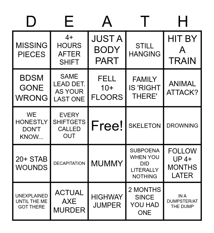 This bingo card has a free space and 24 words: DECAPITATION, ACTUAL AXE MURDER, FELL 10+ FLOORS, UNEXPLAINED UNTIL THE ME GOT THERE, HIT BY A TRAIN, MISSING PIECES, BDSM GONE WRONG, 4+ HOURS AFTER SHIFT, SKELETON, MUMMY, FAMILY IS 'RIGHT THERE', WE HONESTLY DON'T KNOW..., SUBPOENA WHEN YOU DID LITERALLY NOTHING, FOLLOW UP 4+ MONTHS LATER, SAME LEAD DET. AS YOUR LAST ONE, 2 MONTHS SINCE YOU HAD ONE, DROWNING, JUST A BODY PART, ANIMAL ATTACK?, EVERY SHIFTGETS CALLED OUT, IN A DUMPSTER/AT THE DUMP, 20+ STAB WOUNDS, STILL HANGING and HIGHWAY JUMPER.