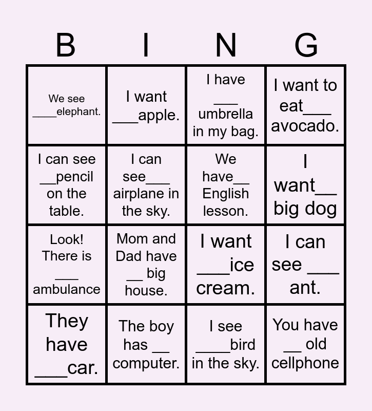 This bingo card has 16 words: The boy has __ computer., I can see ___ ant., I have ___ umbrella in my bag., We see ____elephant., Look! There is ___ ambulance, I want ___apple., I want ___ice cream., I see ____bird in the sky., I can see __pencil on the table., I can see___ airplane in the sky., They have ___car., I want to eat___ avocado., Mom and Dad have __ big house., I want__ big dog, We have__ English lesson. and You have __ old cellphone.