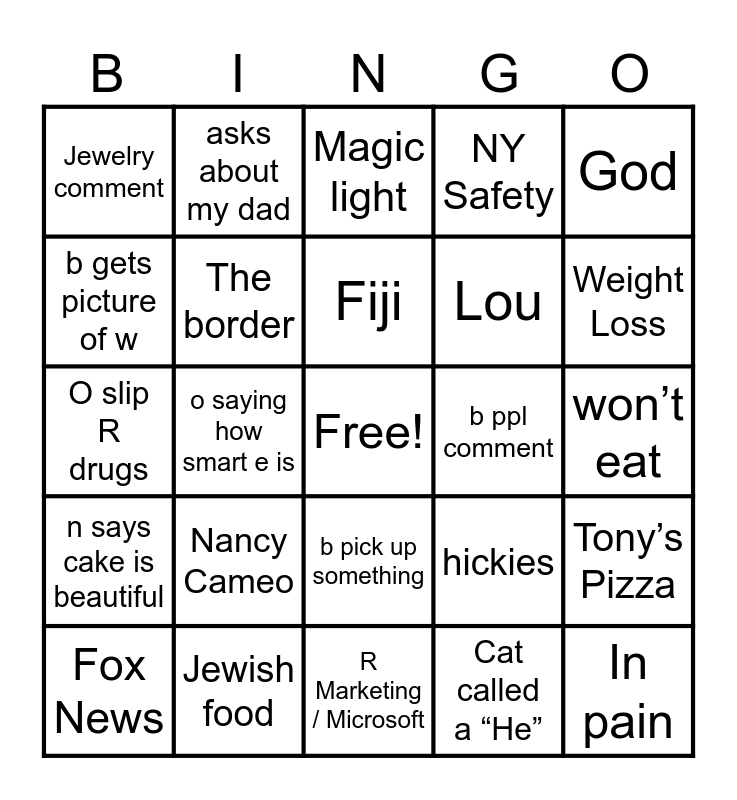 This bingo card has a free space and 24 words: Fox News, Nancy Cameo, Fiji, Cat called a “He”, God, Jewelry comment, asks about my dad, Magic light, b ppl comment, won’t eat, O slip R drugs, The border, hickies, Tony’s Pizza, b gets picture of w, Jewish food, R Marketing / Microsoft, NY Safety, Weight Loss, n says cake is beautiful, o saying how smart e is, b pick up something, Lou and In pain.