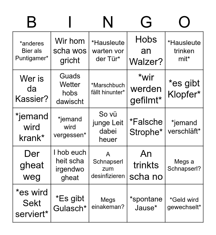 This bingo card has 48 words: I kenn goakan, So vü junge Leit dabei heuer, Heier seits spät drau, Megs einakeman?, I hob euch heit scha irgendwo gheat, Die Nochbarn san ned daham, Wir hom scha wos gricht, Wos Siaßes für die Damen, Wer is da Kassier?, Wo hobs heit augfongan?, Guads Wetter hobs dawischt, Hobs an Walzer?, Megs a Schnapserl?, An trinkts scha no, Wievü Häuser hobs no?, Wullts wos trinken?, *Marschbuch fällt hinunter*, *Falsche Strophe*, *vorgerichtete Stamperl*, *Hausleute trinken mit*, *jemand wird vergessen*, *spontane Jause*, *anderes Bier als Puntigamer*, *wir werden gefilmt*, *Jahresklang wird vergessen*, *es gibt Klopfer*, *es wird Sekt serviert*, *Hausleute sind krank*, A Schnapserl zum desinfizieren, Der gheat weg, Wullts Keks?, Ihr singts jo schen, Brauchts Glasln?, Wo is euer Abschluss?, *Es gibt Gulasch*, Heier seits früh drau, *jemand hat Geburtstag*, *jemand verschläft*, *Person im Haus spielt ein Instrument*, *Briefumschlag wird gefunden*, *man bekommt nichts zu trinken*, *Geld wird gewechselt*, *Hausleute warten vor der Tür*, *Es gibt Frittatensuppe*, *jemand wird krank*, *Bier ist abgelaufen*, *undefinierbarer Schnaps* and *es gibt Abakus*.