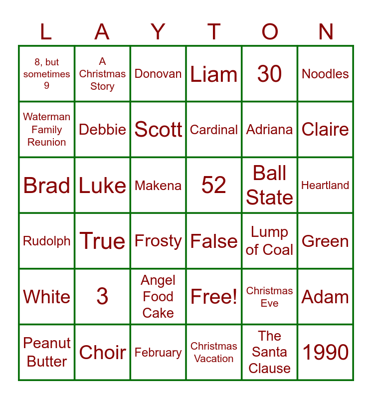 This bingo card has 36 words: Free!, Angel Food Cake, Christmas Vacation, Waterman Family Reunion, Rudolph, 52, Debbie, February, 30, Christmas Eve, Claire, Liam, Adam, Luke, Cardinal, 8, but sometimes 9, White, Ball State, Brad, Donovan, Makena, True, False, Frosty, Lump of Coal, A Christmas Story, Adriana, Choir, Scott, Noodles, 1990, Peanut Butter, Green, Heartland, 3 and The Santa Clause.