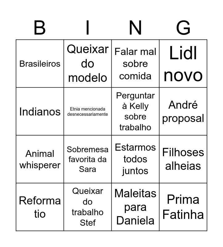 This bingo card has 25 words: Free!, Kelly bebé, André proposal, ciganos, Indianos, Brasileiros, Etnia mencionada desnecessariamente, Queixar do modelo, Queixar do trabalho Stef, Queixar do tamanho do Anúbis, Animal whisperer, Estarmos todos juntos, Last Garcia's Xmas, Tumor cerebral, Perguntar à Kelly sobre trabalho, Móveis do mestre André, Maleitas para Daniela, Falar mal sobre comida, Sobremesa favorita da Sara, Filhoses alheias, Reforma tio, Aniversário surpresa, Prima Fatinha, Lidl novo and Conversa sobre bebés.