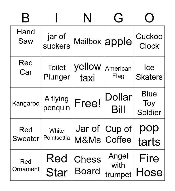 This bingo card has a free space and 29 words: Red Ornament, A bear in a scarf, A flying penquin, Happy Birthday sign, Hand Saw, Mailbox, Toilet Plunger, White Pointsettia, Dollar Bill, Red Star, Blue Toy Soldier, Fire Hose, Chess Board, Angel with trumpet, Ice Skaters, Step Ladder, Jar of M&Ms, Red Sweater, Cuckoo Clock, Kangaroo, Cup of Coffee, Man in a red hat, American Flag, Red Car, apple, jar of suckers, pop tarts, yellow taxi and street lamp.