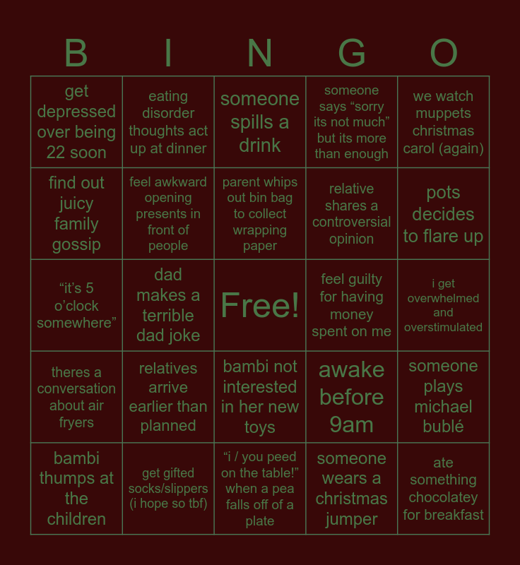 This bingo card has a free space and 24 words: relatives arrive earlier than planned, get gifted socks/slippers (i hope so tbf), parent whips out bin bag to collect wrapping paper, bambi thumps at the children, we watch muppets christmas carol (again), get depressed over being 22 soon, find out juicy family gossip, eating disorder thoughts act up at dinner, feel guilty for having money spent on me, bambi not interested in her new toys, relative shares a controversial opinion, “it’s 5 o’clock somewhere”, awake before 9am, someone plays michael bublé, feel awkward opening presents in front of people, someone wears a christmas jumper, i get overwhelmed and overstimulated, someone spills a drink, pots decides to flare up, dad makes a terrible dad joke, ate something chocolatey for breakfast, theres a conversation about air fryers, someone says “sorry its not much” but its more than enough and “i / you peed on the table!” when a pea falls off of a plate.