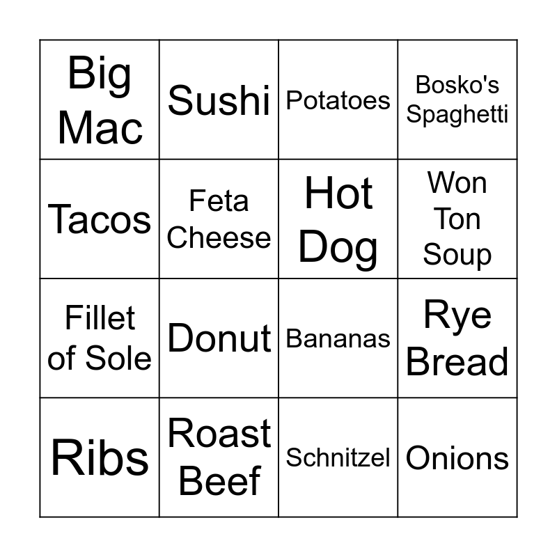 This bingo card has 20 words: Rye Bread, Steak, Potatoes, Walnuts, Ribs, Tacos, Roast Beef, Big Mac, Fillet of Sole, Sushi, Donut, Bananas, Feta Cheese, Onions, Hot Dog, General Tao, Won Ton Soup, Bosko's Spaghetti, Schnitzel and Scone.