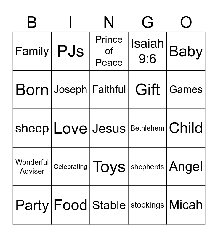 This bingo card has a free space and 38 words: Hope, Christmas, Mary, Joseph, Angel, Celebrating, Faithful, God, Baby, Gift, Love, Isaiah 9:6, Micah, Child, Born, Wonderful Adviser, Father Lives, Prince of Peace, Nazareth, Bethlehem, Family, Food, Games, Party, Manger, Stable, Lamb, King Herod, Elizabeth, Fear not, Holy Spirit, Toys, stockings, PJs, marshmallows, shepherds, sheep and night.