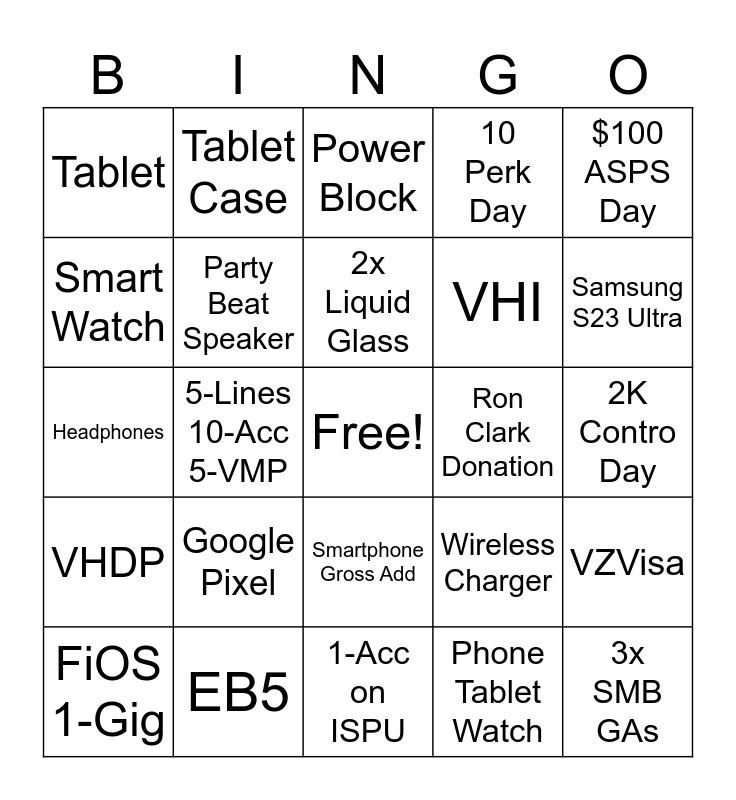 This bingo card has a free space and 24 words: Google Pixel, EB5, 2x Liquid Glass, FiOS 1-Gig, $100 ASPS Day, Tablet, Smart Watch, Tablet Case, Ron Clark Donation, Smartphone Gross Add, VHI, Headphones, Wireless Charger, VZVisa, Party Beat Speaker, Phone Tablet Watch, 2K Contro Day, Power Block, Samsung S23 Ultra, 5-Lines 10-Acc 5-VMP, 3x SMB GAs, VHDP, 10 Perk Day and 1-Acc on ISPU.