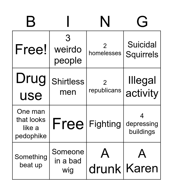 This bingo card has 16 words: Something beat up, Someone in a bad wig, 2 homelesses, Suicidal Squirrels, Drug use, 3 weirdo people, Fighting, 4 depressing buildings, Free!, Shirtless men, A drunk, Illegal activity, One man that looks like a pedophike, Free, 2 republicans and A Karen.