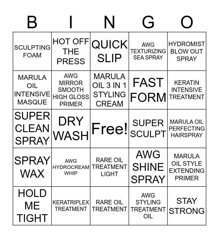 This bingo card has a free space and 24 words: AWG HYDROCREAM WHIP, KERATRIPLEX TREATMENT, MARULA OIL 3 IN 1 STYLING CREAM, HOLD ME TIGHT, HYDROMIST BLOW OUT SPRAY, SCULPTING FOAM, MARULA OIL INTENSIVE MASQUE, HOT OFF THE PRESS, SUPER SCULPT, RARE OIL TREATMENT LIGHT, FAST FORM, SUPER CLEAN SPRAY, AWG SHINE SPRAY, MARULA OIL STYLE EXTENDING PRIMER, AWG MIRROR SMOOTH HIGH GLOSS PRIMER, AWG STYLING TREATMENT OIL, MARULA OIL PERFECTING HAIRSPRAY, QUICK SLIP, KERATIN INTENSIVE TREATMENT, DRY WASH, STAY STRONG, SPRAY WAX, AWG TEXTURIZING SEA SPRAY and RARE OIL TREATMENT.