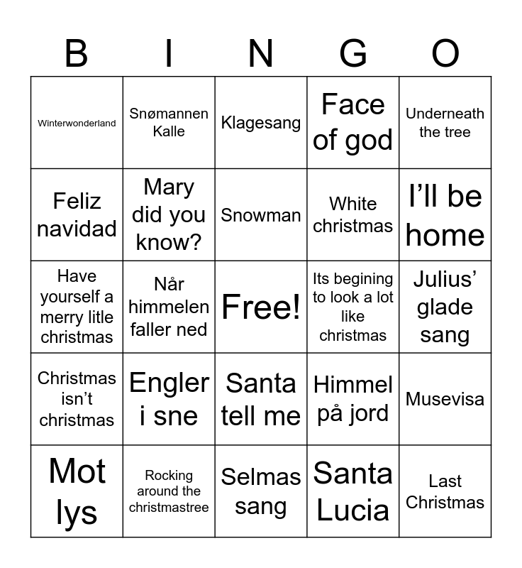 This bingo card has a free space and 52 words: En stjerne skinner i natt, Last Christmas, All I sant for christmas is you, Selmas sang, Engler i sne, Jeg så mamma kysse nissen jeg, Snømannen Kalle, Do they know its christmas?, Feliz navidad, Christmas lights, Mary did you know?, Mistletoe, Musevisa, Himmel på jord, Home for christmas, Driving home for christmas, Snowman, Its begining to look a lot like christmas, Stjernesludd, Underneath the tree, Når himmelen faller ned, Santa Lucia, Winterwonderland, White christmas, Gavejaktnatt, Marry christmas, Magi, Når snøen smelter, I’ll be home, Little drummerboy, Noel, Face of god, Alt jeg ønsker meg, Slalom, Jul i svingen, Klagesang, Rocking around the christmastree, Nå tennes tusen julelys, Happy xmas, Hey Ho, Julefantasi, Julius’ glade sang, Christmas isn’t christmas, Like it’s christmas, Santa tell me, Santa’s coming for us, Jingle bell rock, Have yourself a merry litle christmas, O helga natt, Himlen i min favn, Mot lys and Ho ho ho.