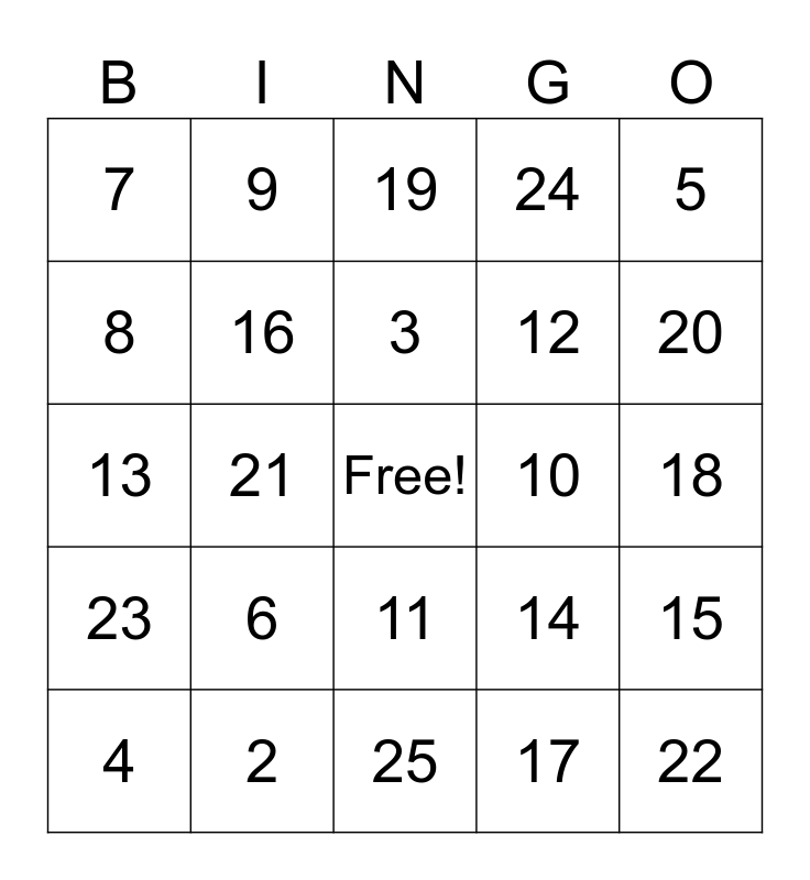 This bingo card has a free space and 24 words: 6, 2, 3, 4, 5, 7, 8, 9, 10, 11, 12, 13, 14, 15, 16, 17, 18, 19, 20, 21, 22, 23, 24 and 25.