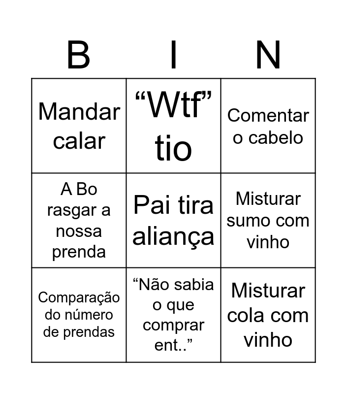 This bingo card has a free space and 16 words: Tocar nas pernas, Lucas amuado, Comentar o cabelo, Mandar calar, A Bo despachar para ir embora, “Wtf” tio, Falar duma viagem, Side eye Mae, Misturar cola com vinho, Misturar sumo com vinho, Comentar o pão de ló, A Bo rasgar a nossa prenda, Explicar a compra da prenda, “Não sabia o que comprar ent..”, Comparação do número de prendas and Lucas dizer palavrão.