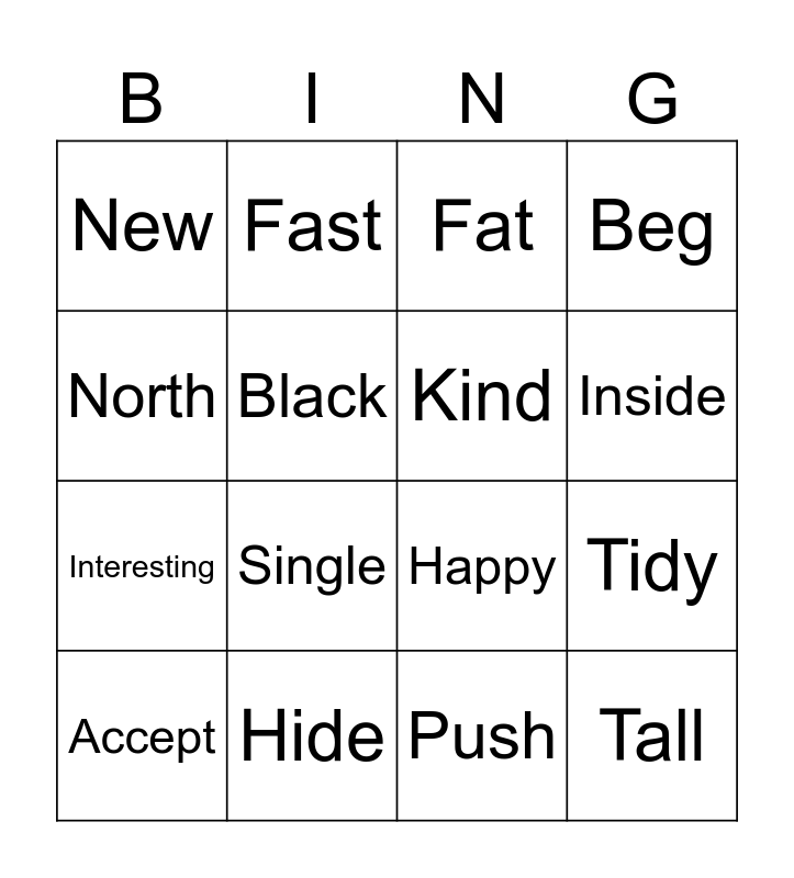 This bingo card has 24 words: Deep, Lazy, Push, Tall, New, Fast, Kind, Beg, Interesting, Hide, Loud, Inside, Before, Sick, Happy, Throw, Accept, Black, First, Tidy, North, Single, Fat and Buy.