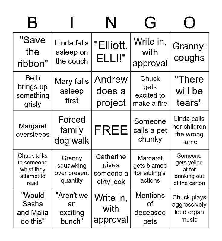 This bingo card has a free space and 24 words: Granny squawking over present quantity, "Aren't we an exciting bunch", Andrew does a project, "Would Sasha and Malia do this", Granny: coughs, "Save the ribbon", Beth brings up something grisly, Linda falls asleep on the couch, Someone calls a pet chunky, Catherine gives someone a dirty look, Chuck gets excited to make a fire, Margaret oversleeps, Margaret gets blamed for sibling's actions, Someone gets yelled at for drinking out of the carton, Mary falls asleep first, Mentions of deceased pets, Linda calls her children the wrong name, "Elliott. ELLI!", "There will be tears", Forced family dog walk, Chuck plays aggressively loud organ music, Chuck talks to someone whist they attempt to read, Write in, with approval and Write in, with approval.