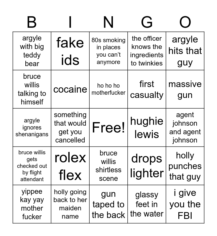 This bingo card has a free space and 29 words: yippee kay yay mother fucker, 80s nudity, something that would get you cancelled, feet fists, argyle with big teddy bear, 80s smoking in places you can’t anymore, cocaine, rolex flex, hughie lewis, holly going back to her maiden name, agent johnson and agent johnson, i give you the FBI, gun taped to the back, glassy feet in the water, massive gun, ulysses doppelgänger, bruce willis shirtless scene, bruce willis gets checked out by flight attendant, argyle hits that guy, argyle ignores shenanigans, drops lighter, crawling in the vent, first casualty, bruce willis talking to himself, the officer knows the ingredients to twinkies, fake ids, holly punches that guy, ho ho ho motherfucker and weird 80s racist moment.