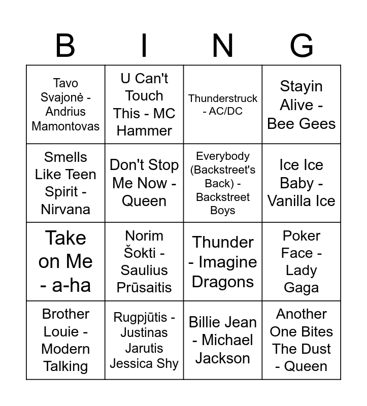 This bingo card has 38 words: Free!, Without Me - Eminem, Last Christmas - Wham!, Everybody (Backstreet's Back) - Backstreet Boys, Sweet Dreams - Eurythmics, Oops! I Did It Again - Britney Spears, Ice Ice Baby - Vanilla Ice, Butterfly - Crazy Town, Smells Like Teen Spirit - Nirvana, Take on Me - a-ha, Poker Face - Lady Gaga, Stayin Alive - Bee Gees, Brother Louie - Modern Talking, Billie Jean - Michael Jackson, Don't Stop Me Now - Queen, Another One Bites The Dust - Queen, It's My Life - Bon Jovi, Thunderstruck - AC/DC, I Was Made For Lovin' You - KISS, Rugpjūtis - Justinas Jarutis Jessica Shy, Tavo Svajonė - Andrius Mamontovas, Tyliai Pakuždėk - Jessica Shy, Norim Šokti - Saulius Prūsaitis, Trys Milijonai - Marijonas Mikutavičius, Margarita - RONDO, Vienas Namuose - Džordana Butkutė, Alyvos - Mango, Sentimentai - Monika LIU, Vėl Švieski - Stasys Povilaitis, Discoteque - THE ROOP, Relax Take It Easy - MIKA, What Is Love - Haddaway, Macarena - Los Del Rio, U Can't Touch This - MC Hammer, Never Gonna Give You Up - Rick Astley, Barbie Girl - Aqua, Thunder - Imagine Dragons and Umbrella - Rihanna.
