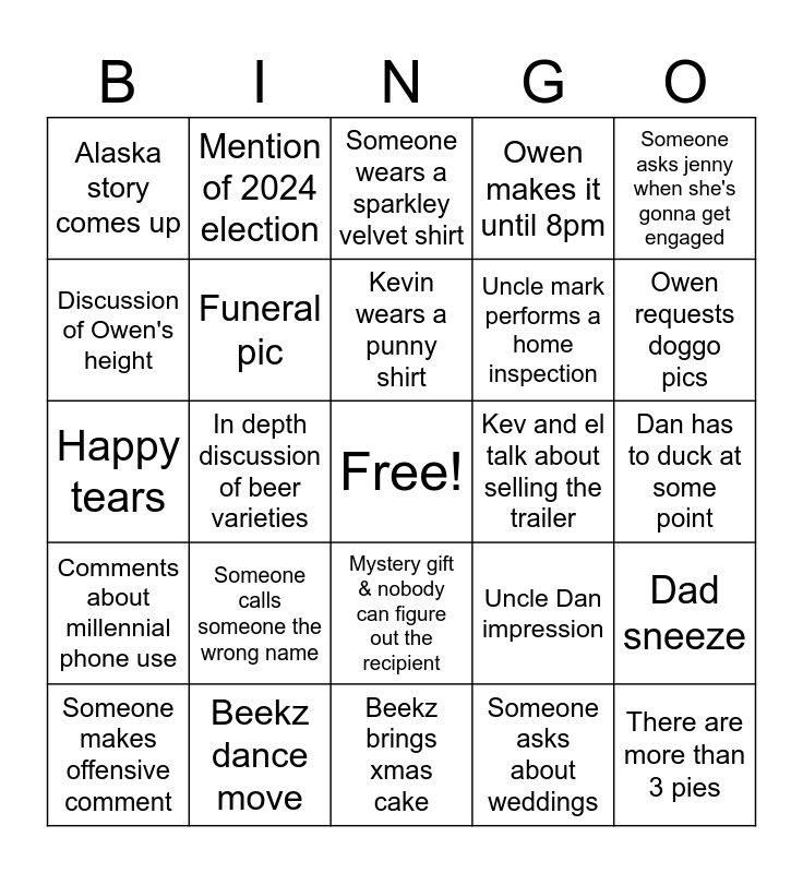 This bingo card has a free space and 29 words: An aunt says have a chair ya little bear, Beekz dance move, Someone wears a sparkley velvet shirt, Someone talks about florida, Someone asks jenny when she's gonna get engaged, Alaska story comes up, Funeral pic, Kevin wears a punny shirt, Kev and el talk about selling the trailer, Dad sneeze, Someone makes offensive comment, In depth discussion of beer varieties, Someone asks about weddings, There are more than 3 pies, Happy tears, Jenny hovers around the sweets table, Beekz brings xmas cake, Uncle Dan impression, Owen requests doggo pics, Comments about millennial phone use, Someone calls someone the wrong name, Dennis brings henny, Uncle mark performs a home inspection, Dan has to duck at some point, Discussion of Owen's height, Mention of 2024 election, Mystery gift & nobody can figure out the recipient, Owen makes it until 8pm and Kev "ho ho hooo merry christmas".