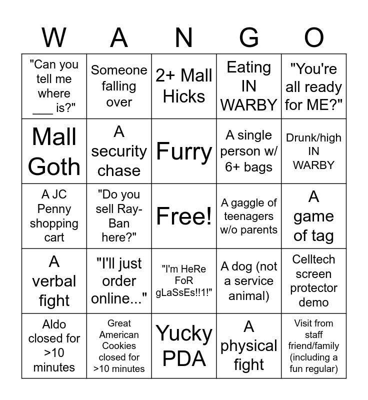 This bingo card has a free space and 27 words: A dog (not a service animal), Build-A-Bear Adult, A single person w/ 6+ bags, Yucky PDA, Mall Goth, 2+ Mall Hicks, Someone falling over, A verbal fight, A gaggle of teenagers w/o parents, Celltech screen protector demo, A JC Penny shopping cart, Eating IN WARBY, Aldo closed for >10 minutes, Great American Cookies closed for >10 minutes, Drunk/high IN WARBY, Kid crying in blue mall stroller/cart, A security chase, Furry, "I'll just order online...", "Can you tell me where ___ is?", A game of tag, A physical fight, "Do you sell Ray-Ban here?", Visit from staff friend/family (including a fun regular), "I'm HeRe FoR gLaSsEs!!1!", "You're all ready for ME?" and Asking about titanium or flex metal frames.