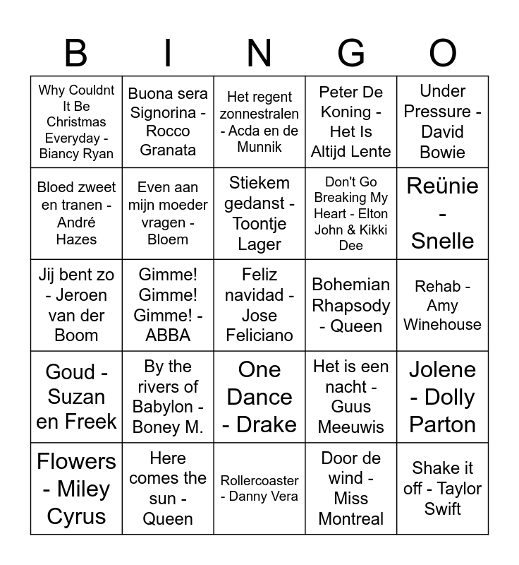 This bingo card has 51 words: Free!, Feliz navidad - Jose Feliciano, Cantique de noel - Andrea Bocelli, Rollercoaster - Danny Vera, By the rivers of Babylon - Boney M., Happy Xmas (War is over) - John Lennon, Buona sera Signorina - Rocco Granata, Kleine café aan de haven - Vader Abraham, Bloed zweet en tranen - André Hazes, Mooi was die tijd - Corrie Konings, Even aan mijn moeder vragen - Bloem, Peter De Koning - Het Is Altijd Lente, Jolene - Dolly Parton, Het is een nacht - Guus Meeuwis, Sinds 1 dag of 2 - Doe Maar, I wanna dance with somebody - Whitney Houston, Stiekem gedanst - Toontje Lager, Bohemian Rhapsody - Queen, Viva La Vida - Coldplay, Under Pressure - David Bowie, Gimme! Gimme! Gimme! - ABBA, Door de wind - Miss Montreal, Why Couldnt It Be Christmas Everyday - Biancy Ryan, Don't Go Breaking My Heart - Elton John & Kikki Dee, Noodgeval - Goldband, Shake it off - Taylor Swift, Reünie - Snelle, Bad guy - Billie Eilish, Flowers - Miley Cyrus, Het regent zonnestralen - Acda en de Munnik, Ladada - Claude, Duurt te lang - Davina Michelle, Ik ga zwemmen - Mart Hoogkramer, Something just like this - Chainsmokers, Atemlos durch die Nacht - Helena Fischer, Here comes the sun - Queen, Lonely this Christmas - Mud, Driving home for Christmas - Chris Rea, I will survive - Gloria Gaynor, Rollin’ in the deep - Adele, Rehab - Amy Winehouse, Goud - Suzan en Freek, Zoutelande - Bløf & Geike, Vanavond (uit m’n bol) - Kriss Kross Amsterdam & Donnie, Als de morgen is gekomen - Jan Smit, Ik wou dat ik jou was - Veldhuis & Kemper, Jij bent zo - Jeroen van der Boom, Sexy als ik dans - Nielson, Father & Friend - Alain & Dane Clark, One Dance - Drake and Shape of you - Ed Sheeran.