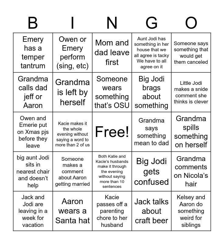 This bingo card has a free space and 24 words: Someone makes a comment about Aaron getting married, Aaron wears a Santa hat, Someone wears something that’s OSU, Jack and Jodi are leaving in a week for vacation, Someone says something that would get them canceled, Emery has a temper tantrum, Grandma calls dad jeff or Aaron, Owen or Emery perform (sing, etc), Grandma says something mean to dad, Both Katie and Kacie’s husbands make it through the evening without saying more than 10 sentences, Big Jodi brags about something, Owen and Emerie put on Xmas pjs before they leave, Big Jodi gets confused, Grandma comments on Nicola’s hair, Grandma is left by herself, Jack talks about craft beer, Grandma spills something on herself, Mom and dad leave first, Little Jodi makes a snide comment she thinks is clever, Kacie makes it the whole evening without saying a word to more than 2 of us, Kelsey and Aaron do something weird for siblings, big aunt Jodi sits in nearest chair and doesn’t help, Aunt Jodi has something in her house that we all agree is tacky We have to all agree on it and Kacie passes off a parenting chore to her husband.