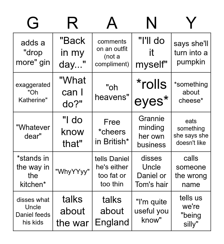 This bingo card has a free space and 24 words: "WhyYYyy", talks about the war, "oh heavens", disses what Uncle Daniel feeds his kids, says she'll turn into a pumpkin, adds a "drop more" gin, exaggerated "Oh Katherine", "Back in my day...", Grannie minding her own business, tells Daniel he's either too fat or too thin, *rolls eyes*, "Whatever dear", disses Uncle Daniel or Tom's hair, calls someone the wrong name, "What can I do?", "I'm quite useful you know", eats something she says she doesn't like, comments on an outfit (not a compliment), *something about cheese*, "I do know that", tells us we're "being silly", *stands in the way in the kitchen*, "I'll do it myself" and talks about England.