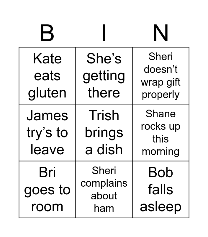 This bingo card has 13 words: Free!, Paul asks about cost, Bri goes to room, She’s getting there, James try’s to leave, Trish brings a dish, Bob falls asleep, Bris Xmas pet post, Sheri complains about ham, Kate eats gluten, Shane rocks up this morning, Sheri doesn’t wrap gift properly and Trish has a gin for xmas.