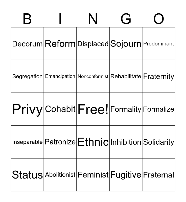 This bingo card has a free space and 30 words: Abolitionist, Affiliate, Cohabit, Conform, Decorum, Displaced, Emancipation, Ethnic, Formality, Feminist, Formalize, Fraternal, Fugitive, Fraternize, Fraternity, Inhabitant, Inhibition, Inseparable, Patronize, Predominant, Privy, Prohibit, Reform, Rehabilitate, Segregation, Sojourn, Solidarity, Status, Nonconformist and Transcend.
