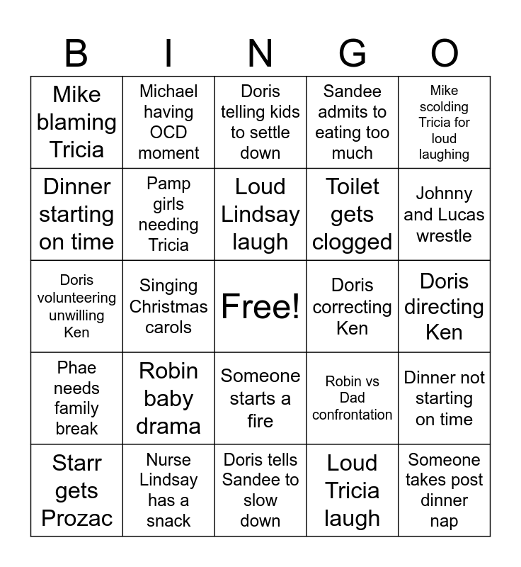 This bingo card has a free space and 24 words: Starr gets Prozac, Robin baby drama, Loud Lindsay laugh, Loud Tricia laugh, Mike scolding Tricia for loud laughing, Mike blaming Tricia, Michael having OCD moment, Doris telling kids to settle down, Doris correcting Ken, Doris directing Ken, Doris volunteering unwilling Ken, Pamp girls needing Tricia, Robin vs Dad confrontation, Dinner not starting on time, Dinner starting on time, Nurse Lindsay has a snack, Doris tells Sandee to slow down, Sandee admits to eating too much, Johnny and Lucas wrestle, Phae needs family break, Singing Christmas carols, Someone starts a fire, Toilet gets clogged and Someone takes post dinner nap.