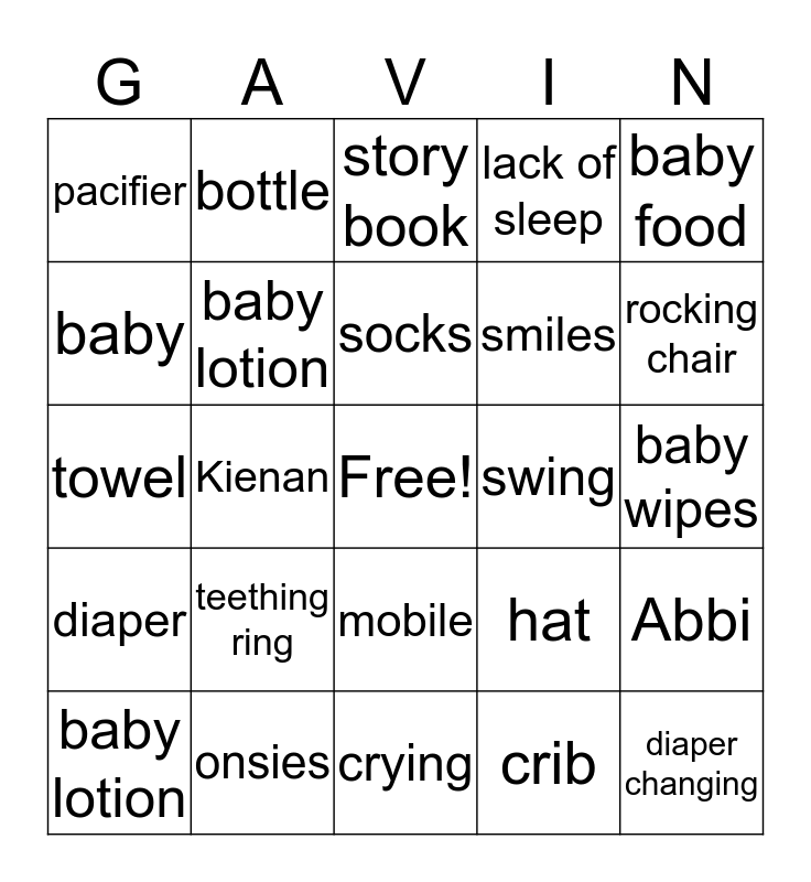 This bingo card has a free space and 34 words: shampoo, crib, blanket, nail clippers, diaper, baby lotion, baby food, baby lotion, bottle, burp cloth, socks, story book, stroller, car seat, swing, rocking chair, onsies, towel, teething ring, hat, mobile, diaper cream, pacifier, baby wipes, crying, diaper changing, lack of sleep, love, smiles, baby, GAVIN, Kienan, Abbi and bouncy.