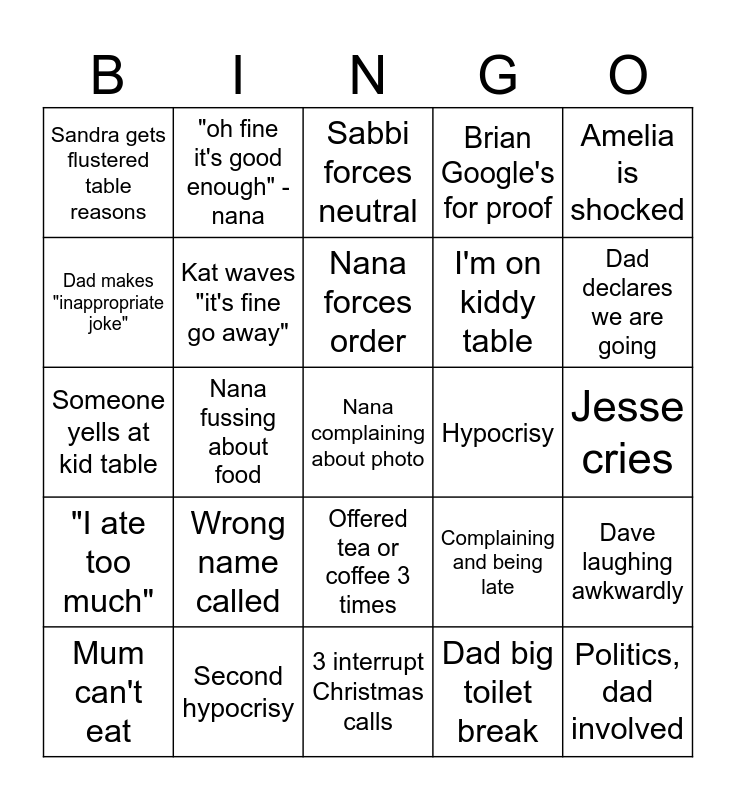 This bingo card has a free space and 24 words: Mum can't eat, Wrong name called, Nana forces order, Dad big toilet break, Amelia is shocked, Sandra gets flustered table reasons, "oh fine it's good enough" -nana, Sabbi forces neutral, Hypocrisy, Jesse cries, Someone yells at kid table, Kat waves "it's fine go away", Complaining and being late, Dave laughing awkwardly, Dad makes "inappropriate joke", Second hypocrisy, 3 interrupt Christmas calls, Brian Google's for proof, Dad declares we are going, "I ate too much", Nana fussing about food, Offered tea or coffee 3 times, I'm on kiddy table and Politics, dad involved.