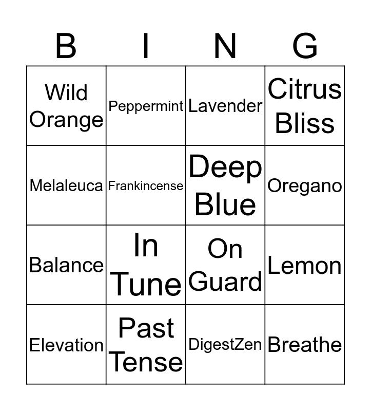 This bingo card has a free space and 15 words: Elevation, Breathe, Lavender, Wild Orange, Oregano, Melaleuca, In Tune, DigestZen, Frankincense, Balance, Lemon, Citrus Bliss, Deep Blue, Peppermint and Past Tense.