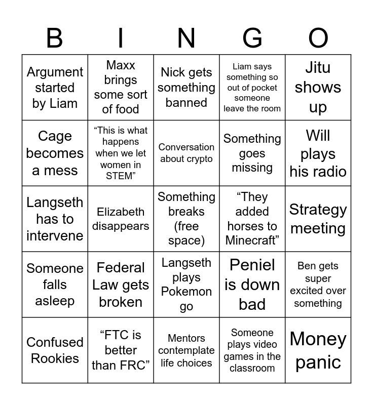 This bingo card has a free space and 24 words: Federal Law gets broken, “FTC is better than FRC”, Conversation about crypto, Confused Rookies, Jitu shows up, Argument started by Liam, Cage becomes a mess, Maxx brings some sort of food, “They added horses to Minecraft”, Langseth plays Pokemon go, Something goes missing, Langseth has to intervene, Peniel is down bad, Ben gets super excited over something, “This is what happens when we let women in STEM”, Someone plays video games in the classroom, Strategy meeting, Nick gets something banned, Will plays his radio, Elizabeth disappears, Money panic, Someone falls asleep, Liam says something so out of pocket someone leave the room and Mentors contemplate life choices.