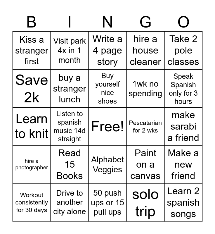This bingo card has a free space and 24 words: Read 15 Books, Drive to another city alone, Buy yourself nice shoes, Workout consistently for 30 days, Take 2 pole classes, Kiss a stranger first, Save 2k, Visit park 4x in 1 month, Pescatarian for 2 wks, Alphabet Veggies, 1wk no spending, Learn to knit, Paint on a canvas, Make a new friend, buy a stranger lunch, solo trip, make sarabi a friend, Write a 4 page story, Speak Spanish only for 3 hours, Listen to spanish music 14d straight, Learn 2 spanish songs, hire a photographer, hire a house cleaner and 50 push ups or 15 pull ups.