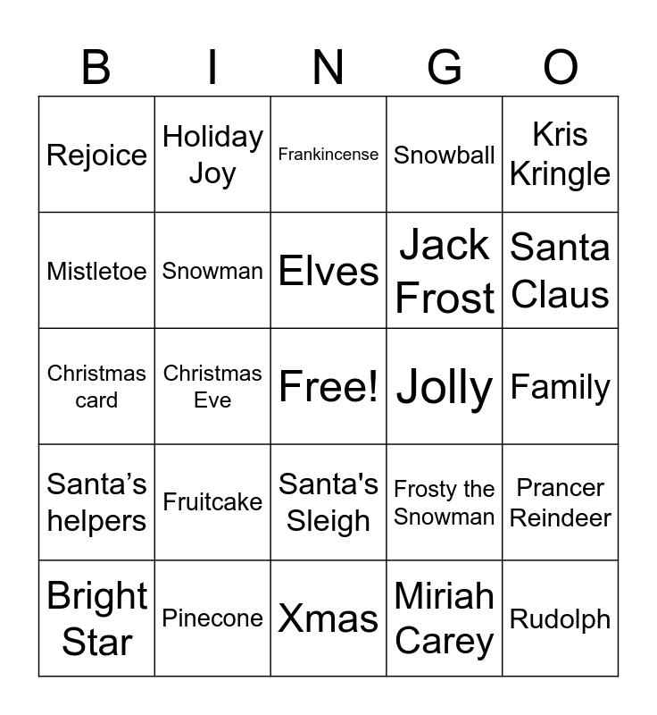 This bingo card has a free space and 25 words: Fruitcake, Xmas, Elves, Bright Star, Kris Kringle, Rejoice, Mistletoe, Holiday Joy, Jolly, Santa's Sleigh, Jack Frost, Christmas card, Frosty the Snowman, Prancer Reindeer, Snowman, Ornaments, Family, Frankincense, Santa Claus, Christmas Eve, Rudolph, Pinecone, Santa’s helpers, Snowball and Miriah Carey.