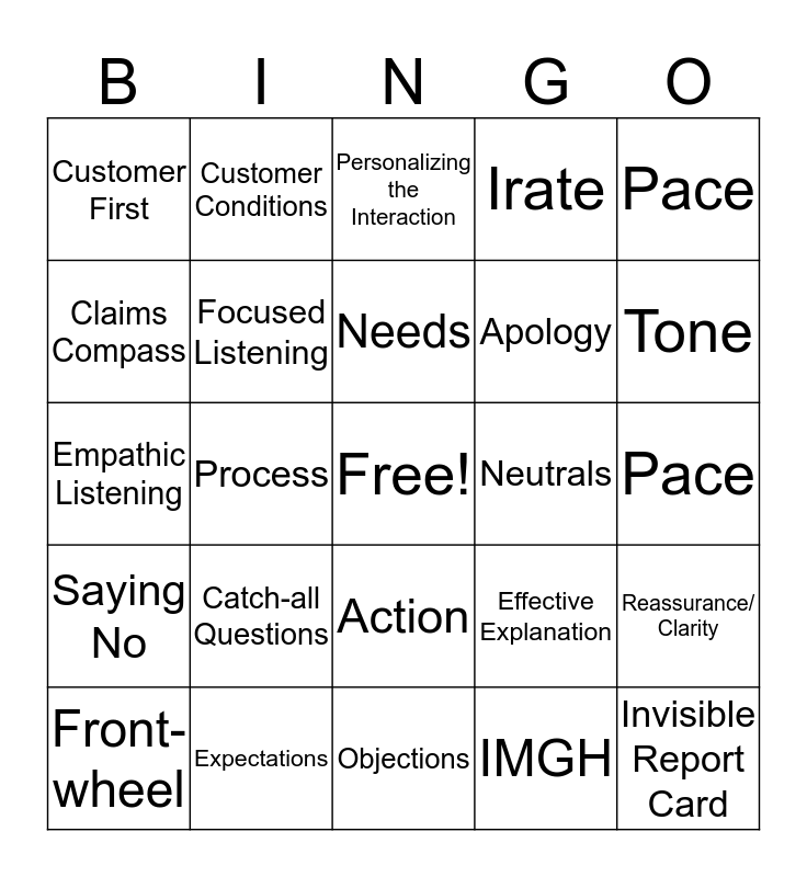 This bingo card has a free space and 24 words: Catch-all Questions, Expectations, Needs, Front-wheel, Pace, Customer First, Claims Compass, Customer Conditions, Neutrals, Action, Apology, Empathic Listening, Effective Explanation, Reassurance/ Clarity, Focused Listening, IMGH, Pace, Personalizing the Interaction, Tone, Process, Invisible Report Card, Saying No, Irate and Objections.