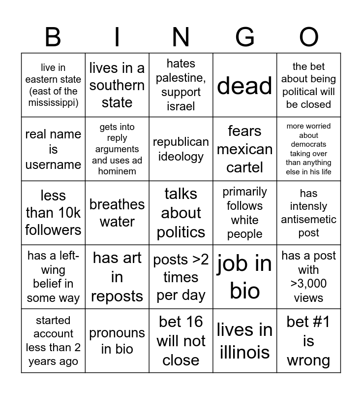 This bingo card has a free space and 24 words: has art in reposts, pronouns in bio, republican ideology, started account less than 2 years ago, the bet about being political will be closed, live in eastern state (east of the mississippi), real name is username, lives in a southern state, primarily follows white people, posts >2 times per day, fears mexican cartel, less than 10k followers, job in bio, has a post with >3,000 views, gets into reply arguments and uses ad hominem, lives in illinois, has intensly antisemetic post, hates palestine, support israel, more worried about democrats taking over than anything else in his life, breathes water, bet #1 is wrong, has a left-wing belief in some way, dead and bet 16 will not close.