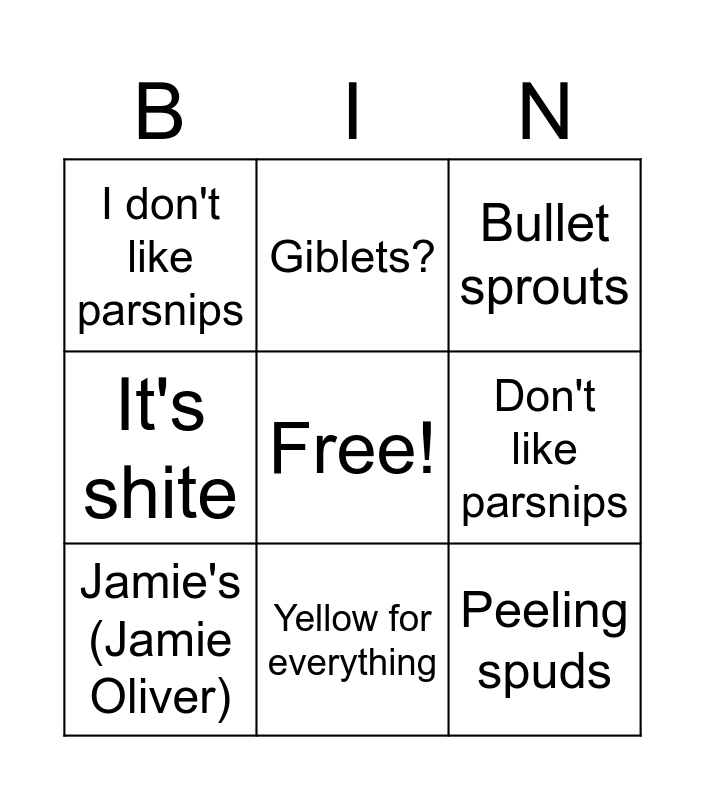 This bingo card has a free space and 15 words: It's a wonderful life, Kirsty MacColl, Bullet sprouts, I don't like parsnips, Yellow for everything, Peeling spuds, Loganberries, B and Q don't do wooden bases anymore, Don't like parsnips, Sunderland, Courtney Love, It's shite, Jamie's (Jamie Oliver), Giblets? and My cat (Xmas themed only).