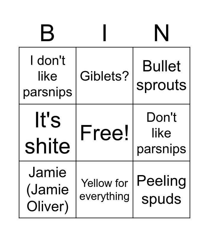 This bingo card has a free space and 15 words: It's a wonderful life, Kirsty MacColl, Bullet sprouts, I don't like parsnips, Yellow for everything, Peeling spuds, Loganberries, B and Q don't do wooden bases anymore, Don't like parsnips, Sunderland, Courtney Love, It's shite, Jamie (Jamie Oliver), Giblets? and My cat (Xmas themed only).