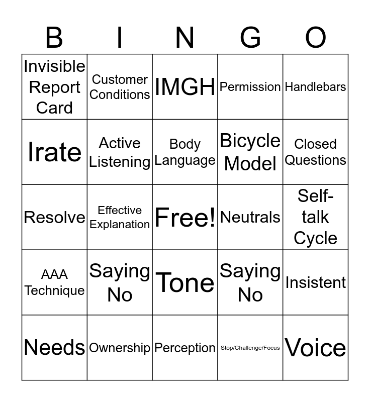 This bingo card has a free space and 24 words: Saying No, Ownership, Body Language, Needs, Handlebars, Invisible Report Card, Irate, Customer Conditions, Neutrals, Tone, Bicycle Model, Resolve, Saying No, Insistent, Active Listening, Stop/Challenge/Focus, Self-talk Cycle, IMGH, Closed Questions, Effective Explanation, Voice, AAA Technique, Permission and Perception.