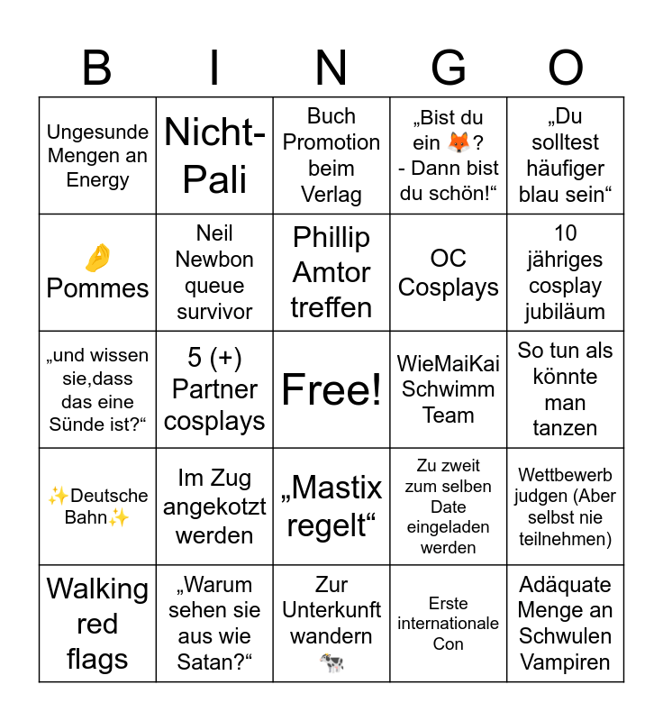 This bingo card has a free space and 24 words: Im Zug angekotzt werden, „Warum sehen sie aus wie Satan?“, Phillip Amtor treffen, Walking red flags, „Du solltest häufiger blau sein“, Ungesunde Mengen an Energy, 🤌 Pommes, Nicht- Pali, WieMaiKai Schwimm Team, „Mastix regelt“, OC Cosplays, „und wissen sie,dass das eine Sünde ist?“, Zu zweit zum selben Date eingeladen werden, Wettbewerb judgen (Aber selbst nie teilnehmen), Neil Newbon queue survivor, Erste internationale Con, So tun als könnte man tanzen, Buch Promotion beim Verlag, 10 jähriges cosplay jubiläum, 5 (+) Partner cosplays, Adäquate Menge an Schwulen Vampiren, ✨Deutsche Bahn✨, „Bist du ein 🦊? - Dann bist du schön!“ and Zur Unterkunft wandern 🐄.