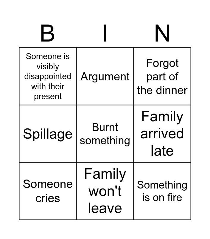 This bingo card has a free space and 8 words: Family arrived late, Forgot part of the dinner, Argument, Someone cries, Someone is visibly disappointed with their present, Something is on fire, Spillage and Family won't leave.