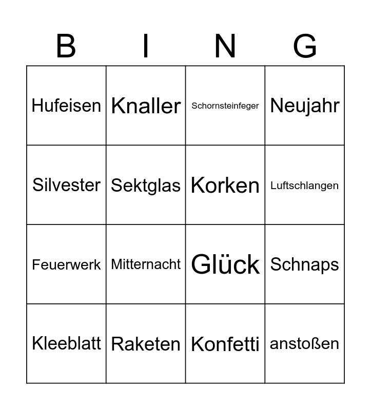 This bingo card has 16 words: Raketen, Schnaps, Schornsteinfeger, Hufeisen, Feuerwerk, Knaller, Glück, Konfetti, Silvester, Sektglas, Kleeblatt, Neujahr, Mitternacht, Luftschlangen, Korken and anstoßen.