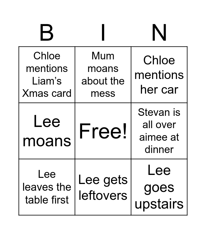 This bingo card has a free space and 16 words: Meg shouts at Stevan, Lee has a pop at mum, Chloe mentions her car, Chloe mentions Liam’s Xmas card, Amie has a high sugar level, Mum moans about the mess, Meg gets grumpy, Any kind of argument happens, Lee goes upstairs, Stevan is all over aimee at dinner, Someone’s puts ketchup on dinner, Lee moans, Chloe mentions Liam 5 times, Lee gets leftovers, Lee leaves the table first and The dog get stressed.