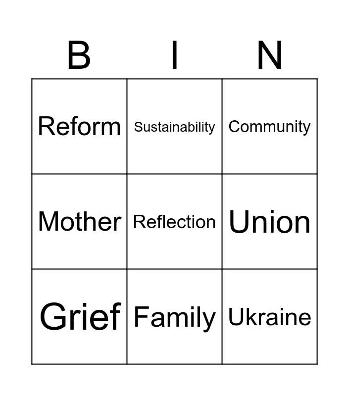 This bingo card has 26 words: Free!, Environment, Family, Change, Reflection, Reform, Union, Sustainability, Happy, Challenge, Ukraine, Festive, Hardship, Mosques, Deeply, Crown, Mother, Faith, Community, Light, Peace, Commonwealth, Disaster, Distance, Grief and Common.