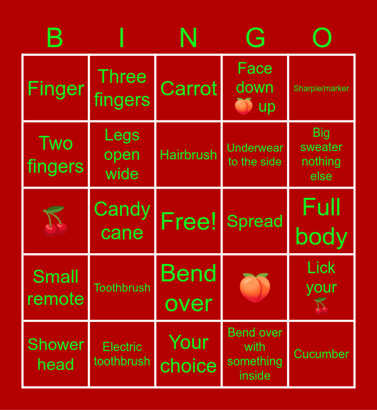 This bingo card has a free space and 24 words: Toothbrush, Electric toothbrush, Hairbrush, Shower head, Sharpie/marker, Finger, Two fingers, Three fingers, Spread, Bend over, Underwear to the side, 🍒, 🍑, Lick your 🍒, Legs open wide, Bend over with something inside, Full body, Carrot, Big sweater nothing else, Candy cane, Cucumber, Small remote, Face down 🍑 up and Your choice.