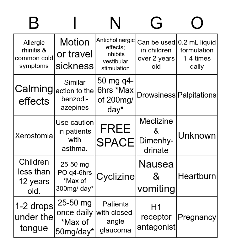 This bingo card has a free space and 24 words: 25-50 mg PO q4-6hrs *Max of 300mg/ day*, 25-50 mg once daily *Max of 50mg/day*, 50 mg q4-6hrs *Max of 200mg/ day*, 1-2 drops under the tongue, 0.2 mL liquid formulation 1-4 times daily, Allergic rhinitis & common cold symptoms, Calming effects, Motion or travel sickness, Meclizine & Dimenhy- drinate, Cyclizine, Drowsiness, Xerostomia, Nausea & vomiting, Heartburn, Similar action to the benzodi- azepines, H1 receptor antagonist, Unknown, Anticholinergic effects; inhibits vestibular stimulation, Palpitations, Use caution in patients with asthma., Pregnancy, Children less than 12 years old., Can be used in children over 2 years old and Patients with closed- angle glaucoma.