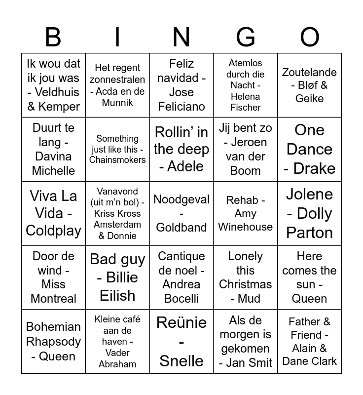 This bingo card has 50 words: Don't Go Breaking My Heart - Elton John & Kikki Dee, Noodgeval - Goldband, Shake it off - Taylor Swift, Reünie - Snelle, Bad guy - Billie Eilish, Flowers - Miley Cyrus, Het regent zonnestralen - Acda en de Munnik, Ladada - Claude, Duurt te lang - Davina Michelle, Ik ga zwemmen - Mart Hoogkramer, Something just like this - Chainsmokers, Atemlos durch die Nacht - Helena Fischer, Here comes the sun - Queen, Lonely this Christmas - Mud, Driving home for Christmas - Chris Rea, I will survive - Gloria Gaynor, Rollin’ in the deep - Adele, Rehab - Amy Winehouse, Goud - Suzan en Freek, Zoutelande - Bløf & Geike, Vanavond (uit m’n bol) - Kriss Kross Amsterdam & Donnie, Als de morgen is gekomen - Jan Smit, Ik wou dat ik jou was - Veldhuis & Kemper, Jij bent zo - Jeroen van der Boom, Sexy als ik dans - Nielson, Father & Friend - Alain & Dane Clark, One Dance - Drake, Shape of you - Ed Sheeran, Feliz navidad - Jose Feliciano, Cantique de noel - Andrea Bocelli, Rollercoaster - Danny Vera, By the rivers of Babylon - Boney M., Happy Xmas (War is over) - John Lennon, Buona sera Signorina - Rocco Granata, Kleine café aan de haven - Vader Abraham, Bloed zweet en tranen - André Hazes, Mooi was die tijd - Corrie Konings, Even aan mijn moeder vragen - Bloem, Peter De Koning - Het Is Altijd Lente, Jolene - Dolly Parton, Het is een nacht - Guus Meeuwis, Sinds 1 dag of 2 - Doe Maar, I wanna dance with somebody - Whitney Houston, Stiekem gedanst - Toontje Lager, Bohemian Rhapsody - Queen, Viva La Vida - Coldplay, Under Pressure - David Bowie, Gimme! Gimme! Gimme! - ABBA, Door de wind - Miss Montreal and Why Couldnt It Be Christmas Everyday - Biancy Ryan.